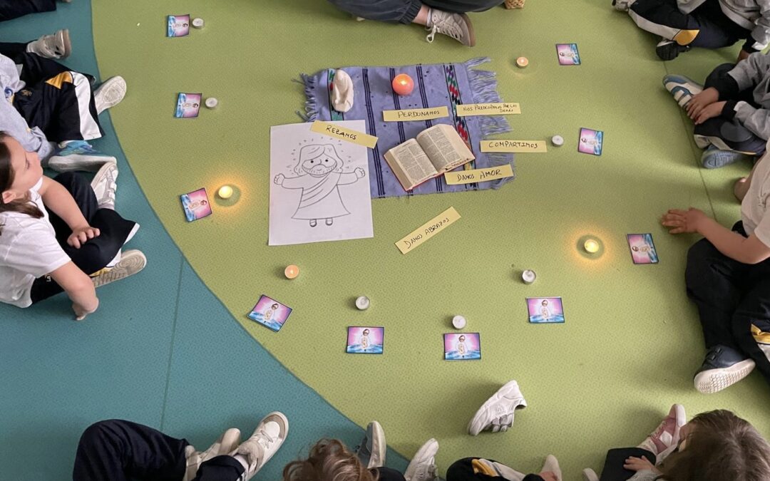 Es importante que en estas celebraciones se fomente un ambiente de respeto, donde la fe cristiana se comparta de forma natural y cercana. Y en este momento tan especial, nos acompañan los símbolos sobre los que hemos ido trabajando, con las producciones individuales que nuestros alumnos han creado, y las reflexiones a las que cada uno ha ido llegando.