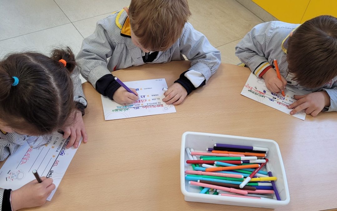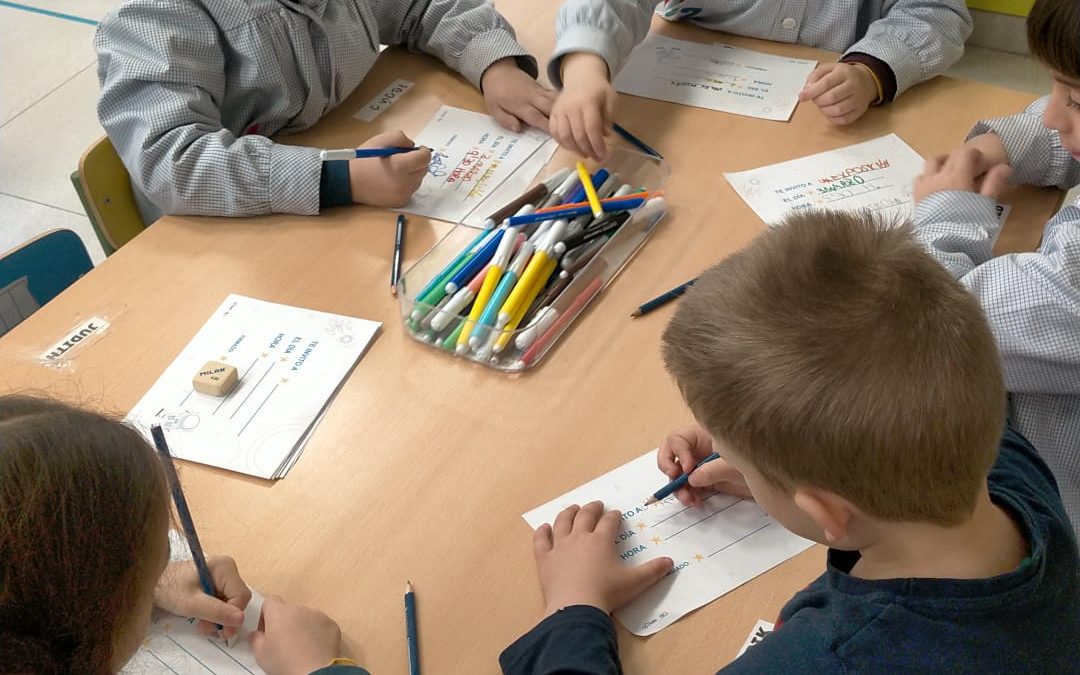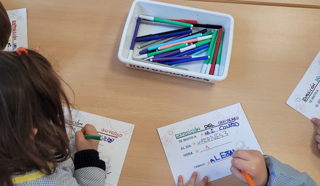 Previo a la celebración del aprendizaje los niños/as escriben un mensaje para las familias, invitándolas a una exposición final, donde se recogen parte de las actividades y elaboraciones realizadas a lo largo del proyecto. Es una forma motivadora para trabajar la competencia lingüística, puesto que ese mensaje lo van a recibir personas importantes para ellos, descubriendo así, un uso funcional y significativo de la escritura.
