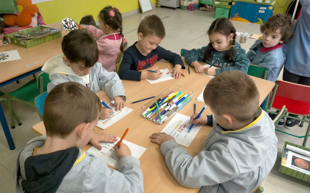 En esta propuesta, el lenguaje escrito hace su aparición para desarrollar con el alumnado tareas que vayan asentando su proceso madurativo desde el interés por aprender y comunicarse. Los alumnos de tres años ponen su firma, los alumnos de 4 años al igual que los de 5 años introducen palabras clave en este mensaje, de esta forma se les va proponiendo retos alcanzables, poniendo a prueba sus conocimientos, experiencias y habilidades, en todo momento, respetando la madurez individual de los niños, así llevan a cabo pequeños procesos de abstracción de una manera favorable y adecuada.